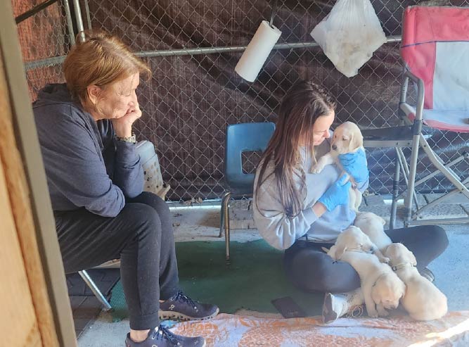 We are a small AKC Labrador Retriever breeder. We have three labs. Maggie Mae, Zeva, and big boy Gus. Maggie Mae is the mother of Zeva. Maggie Mae is a yellow English Labrador Retriever, She was spayed after her last litter. She produced 5 litters, and we decided to retire her. She is our pet now, Zeva is Maggie Mae's daughter. The sire was Deets an Amerian Labrador Retriever. She is a mix of English, and American AKC Registered Labrador Retriever. We will breed her again with Gus for our nest litter scheduled to arrive June 2024.